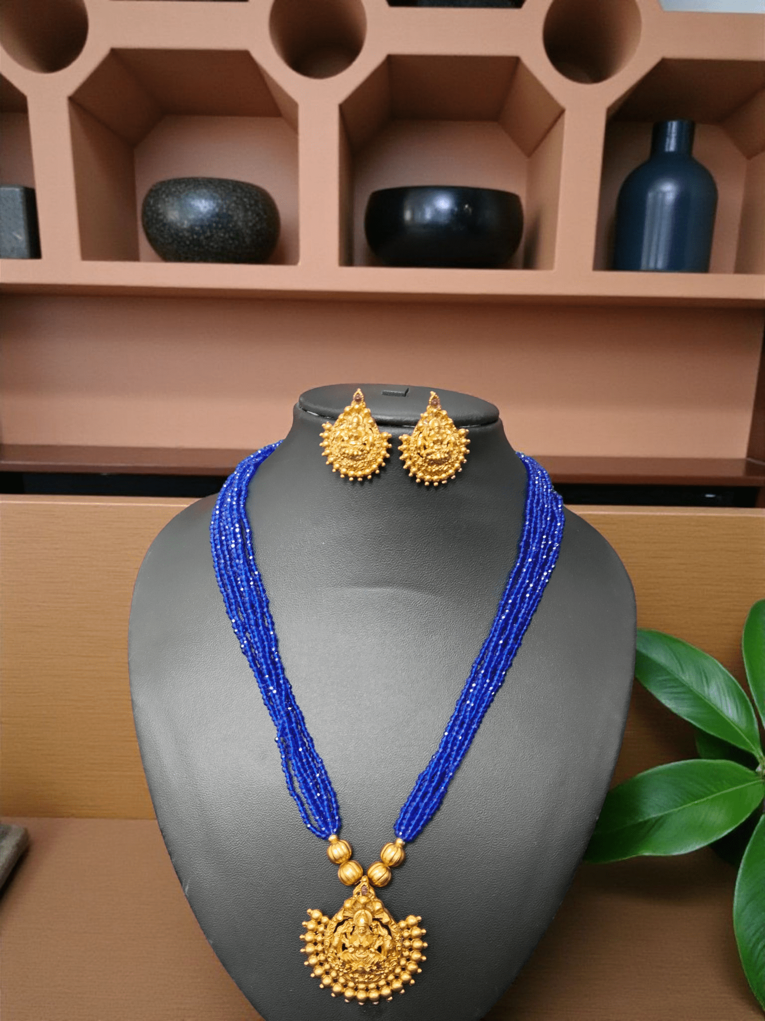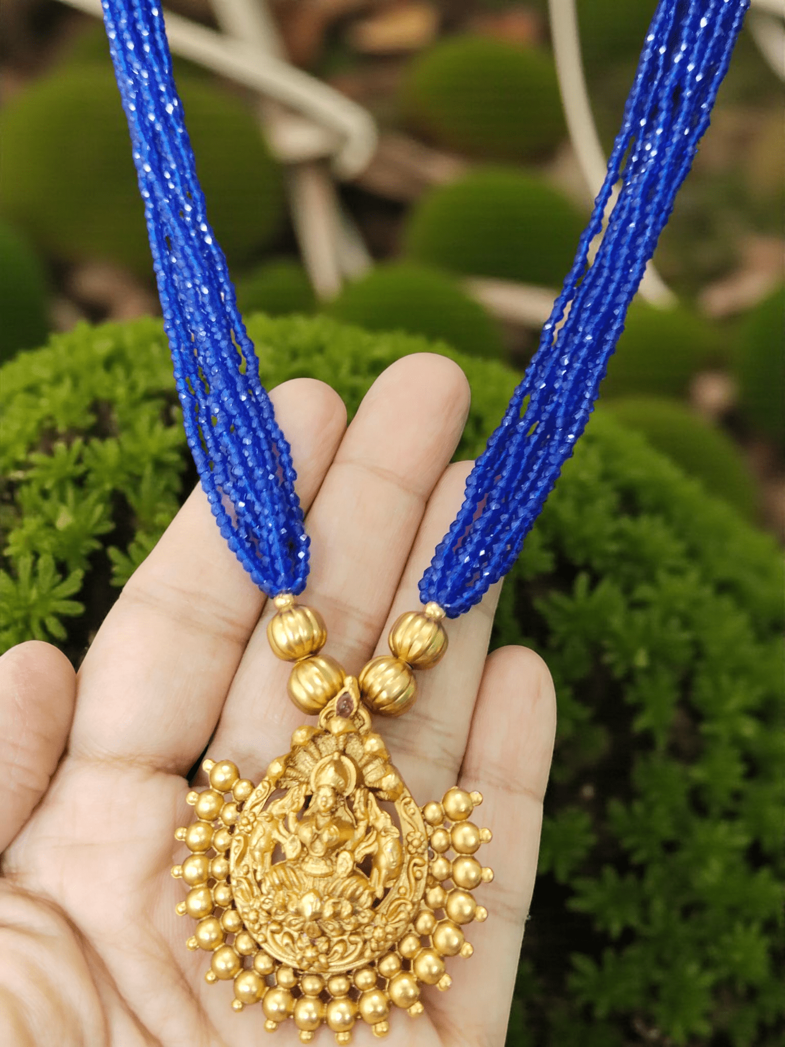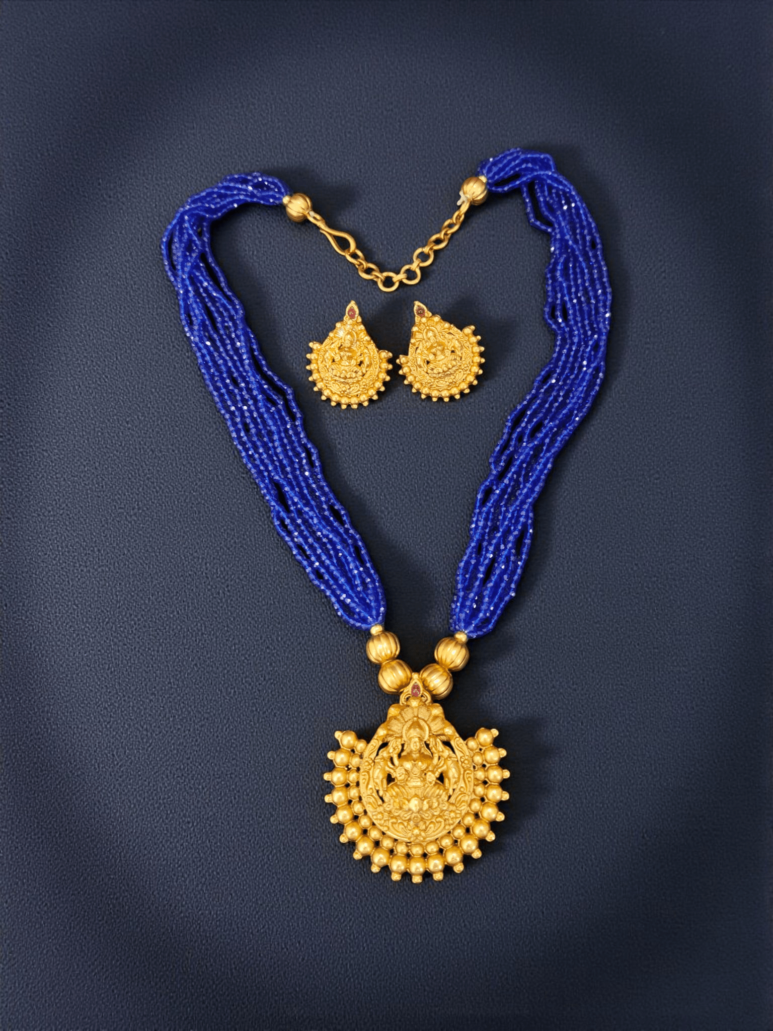 Sapphire Strand Goddess Sugar Beaded Lakshmi Devi Pendant Traditional Necklace Set